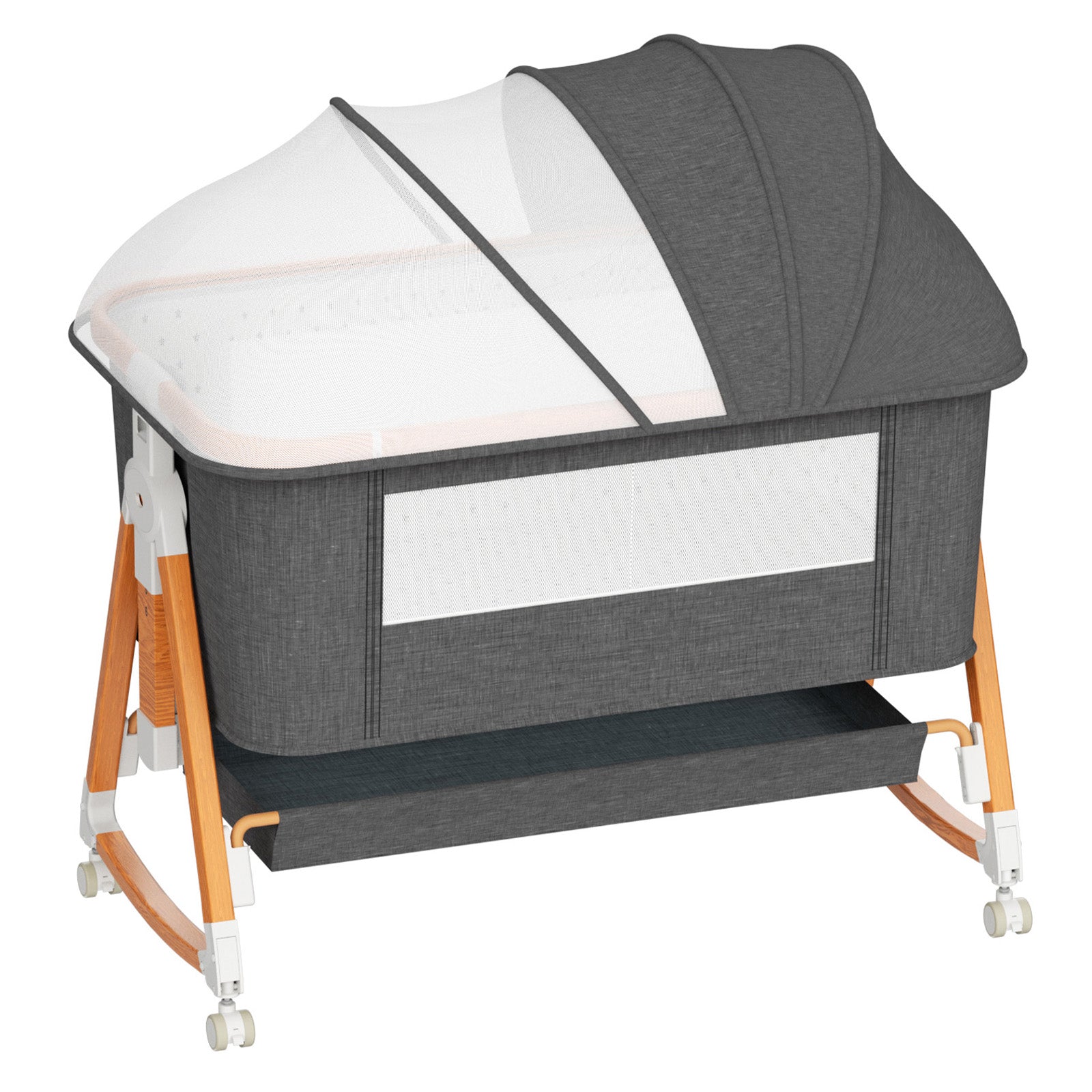 - Premium Wood Frame and Spacious Storage: Crafted from robust hardwood, the bassinet's triangular frame is lightweight and stable. The spacious storage area is perfect for keeping baby essentials like feeding bottles, diapers, and toys within reach