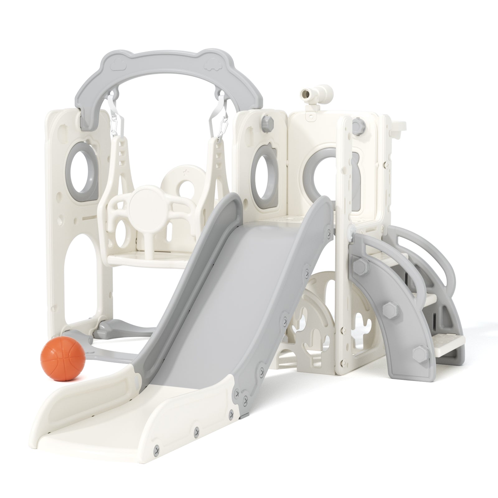 - 8-in-1 Play Features: Combines climbing wall, swing seat, slide, basketball hoop, hide-and-seek hole, play telescope, golf set, and storage – fostering active play and creativity.