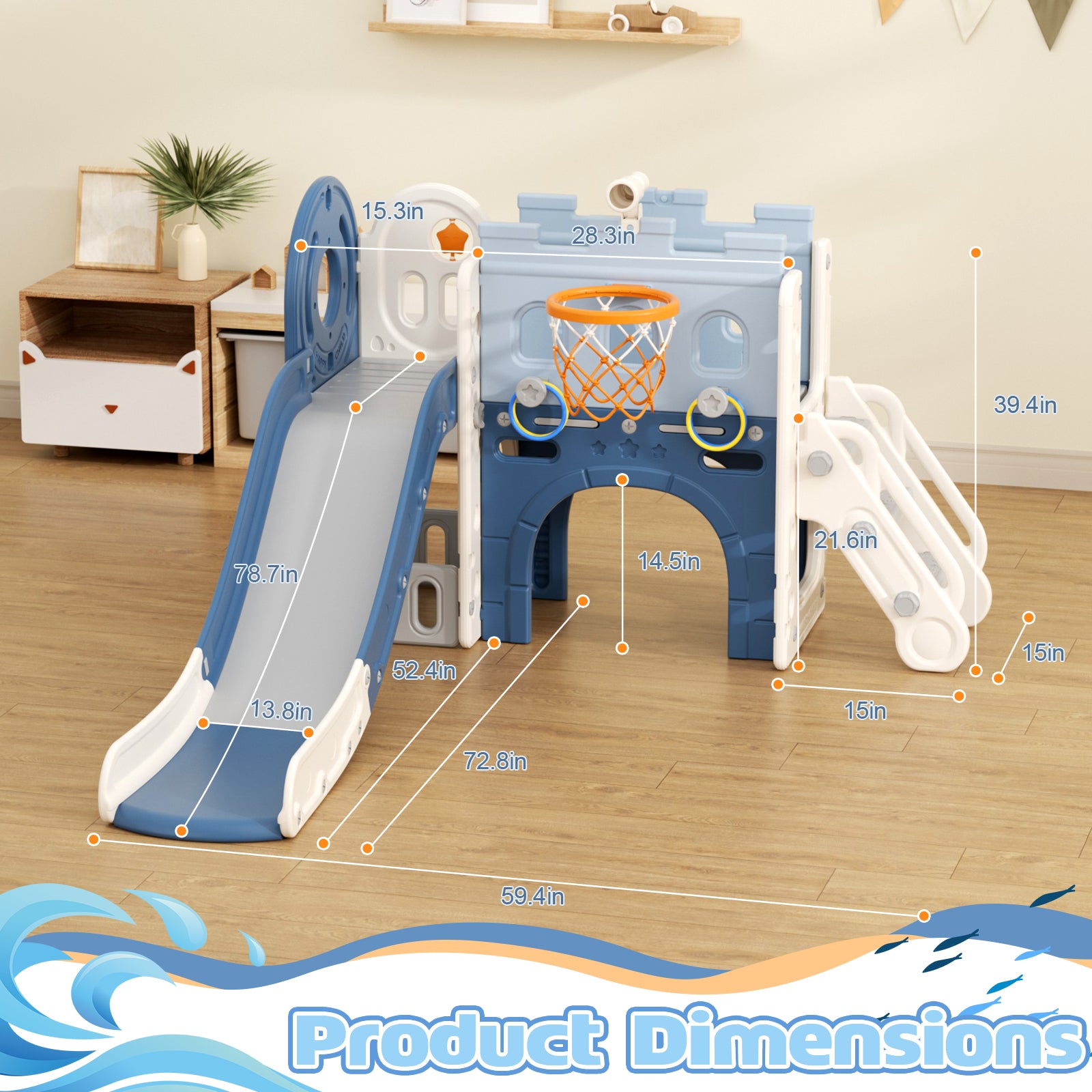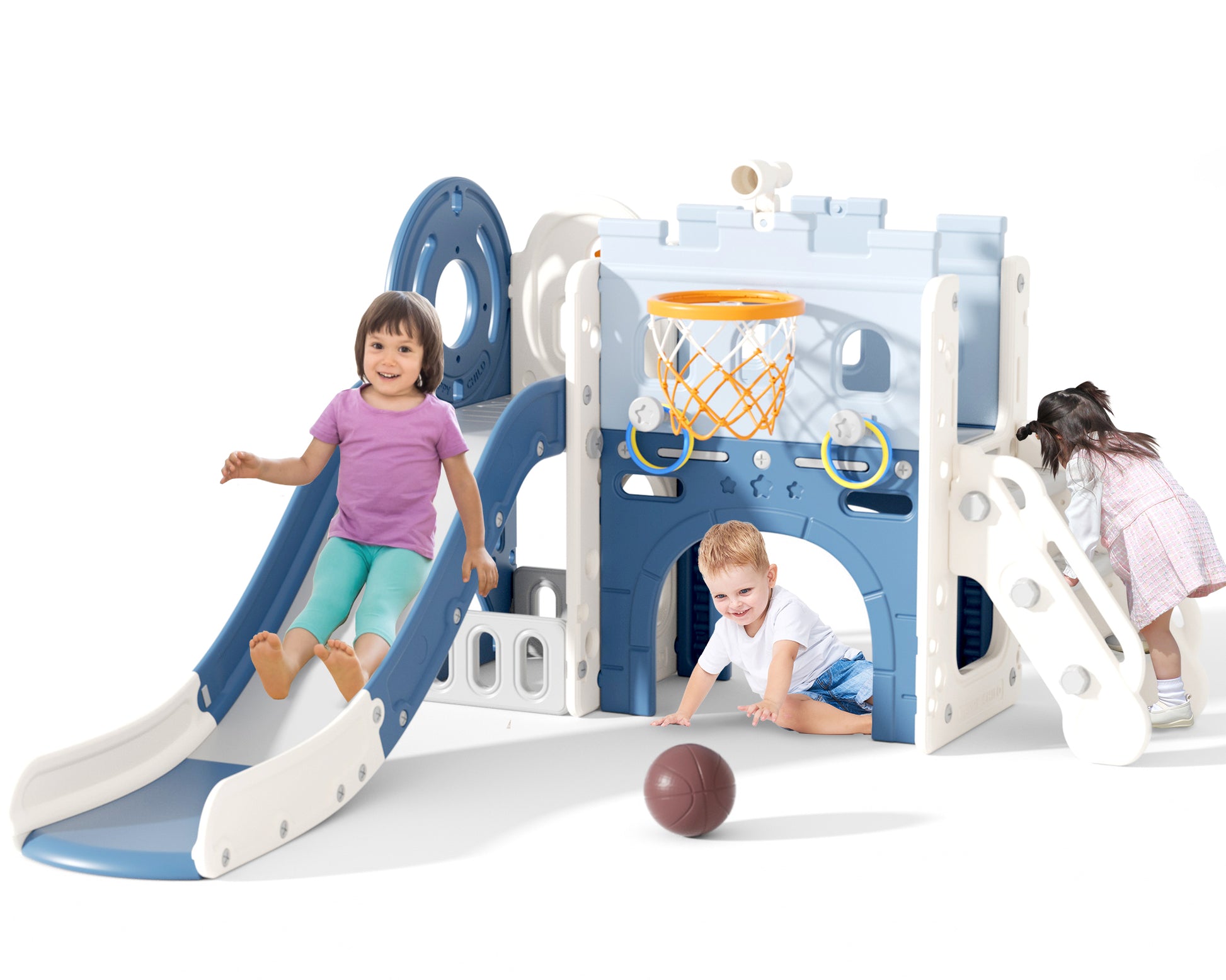 Activity Areas: 8 (climber, slide, hiding window, aisle, tunnel, basketball shooting, play telescope, ring toss)