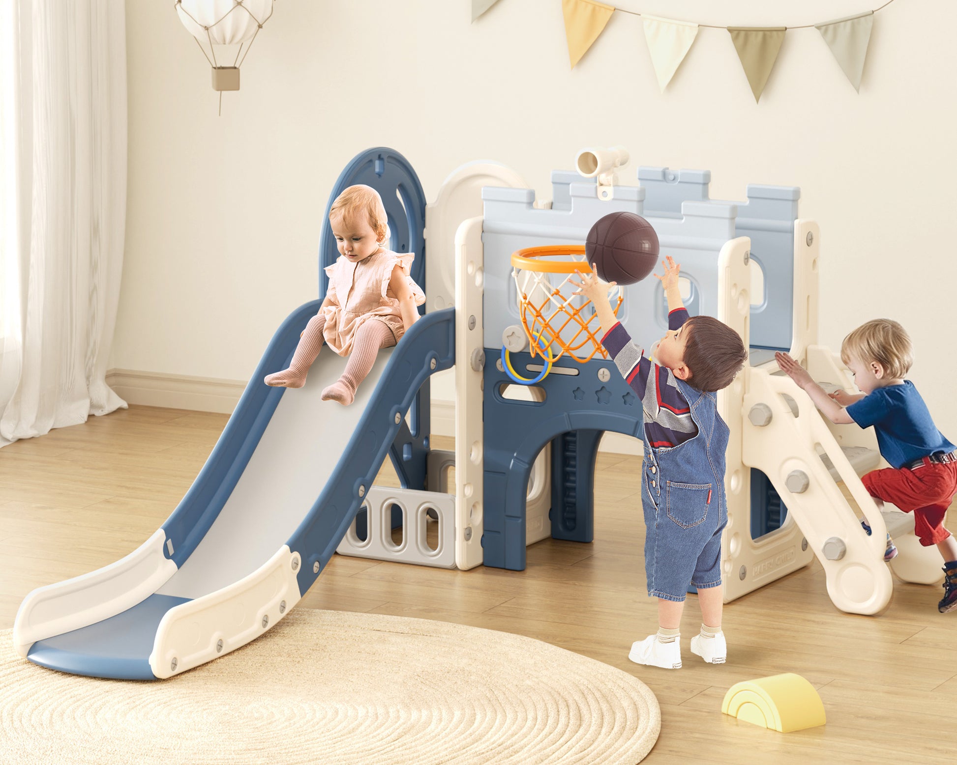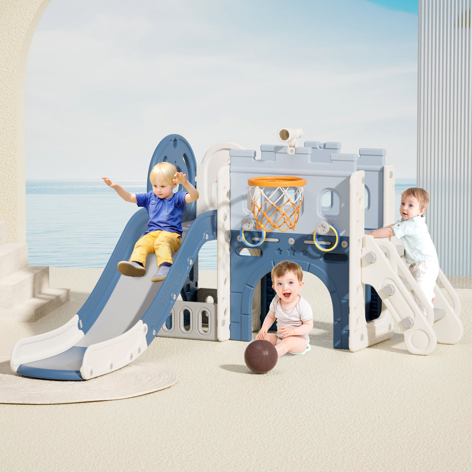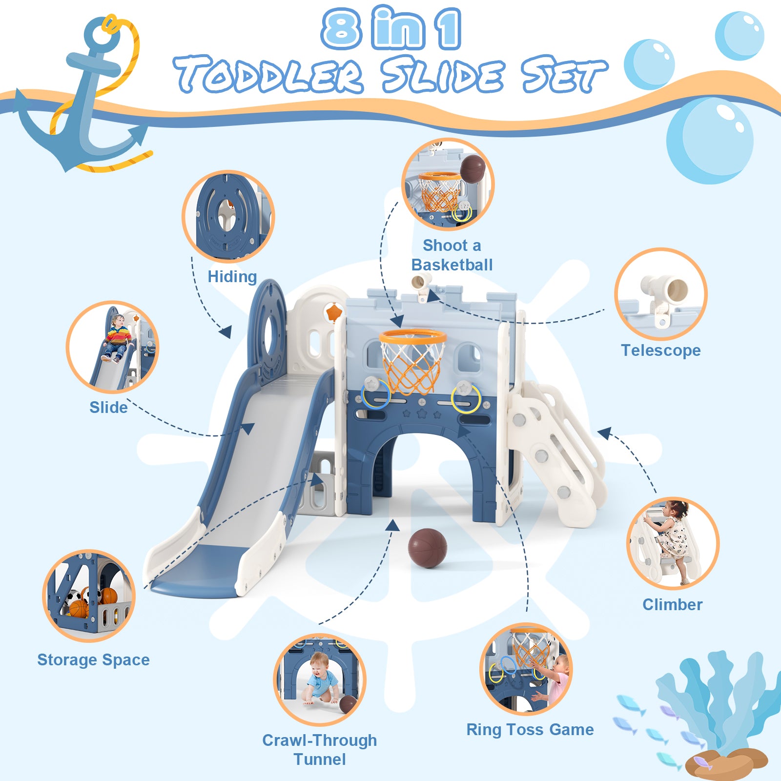 XJD 8-in-1 Toddler Slide, Kids Slide Playset with Basketball Hoop, Telescopes, Indoor Outdoor Kids Play Equipment Backyard Playground for Toddlers Age 1-3, Blue