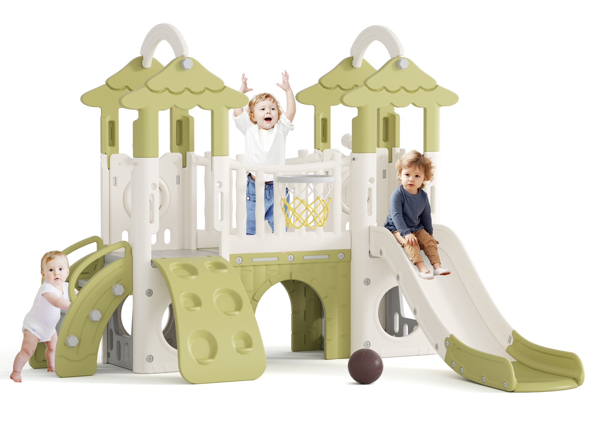 Kids slide has 7 activity areas, plus 2 storage spaces,With our climbing wall, 3-step stair, 5ft slide, crawl-through tunnel, and basketball hoop, including stairs, slide, aisle, shoot a basket area, hide and seek area, ring toss, telescope, and climbing area at the bottom