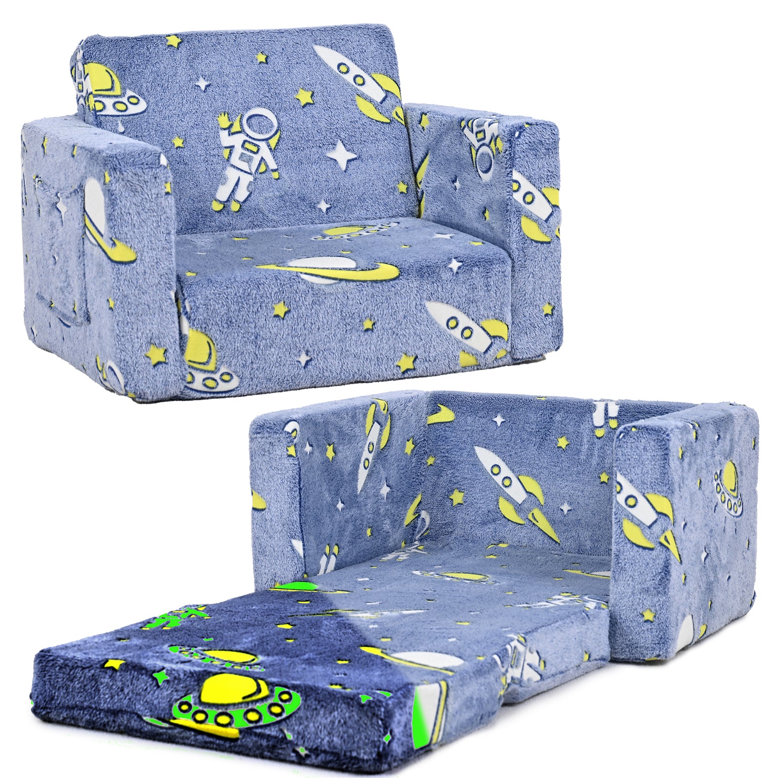 - Unique Blue Fluorescence Toddler Couch: This kids' couch features a unique glow-in-the-dark design that activates after a short period in sunlight, providing a magical experience for your child during nighttime. The Toddler Couch is both a folding sofa and a fold-out bed, perfect for a nap or a sleepover.