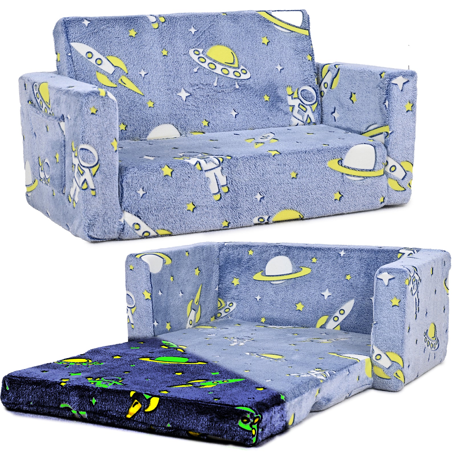 - Unique Blue Fluorescence Toddler Couch: This kids' couch features a unique glow-in-the-dark design that activates after a short period in sunlight, providing a magical experience for your child during nighttime. The Toddler Couch is both a folding sofa and a fold-out bed, perfect for a nap or a sleepover.