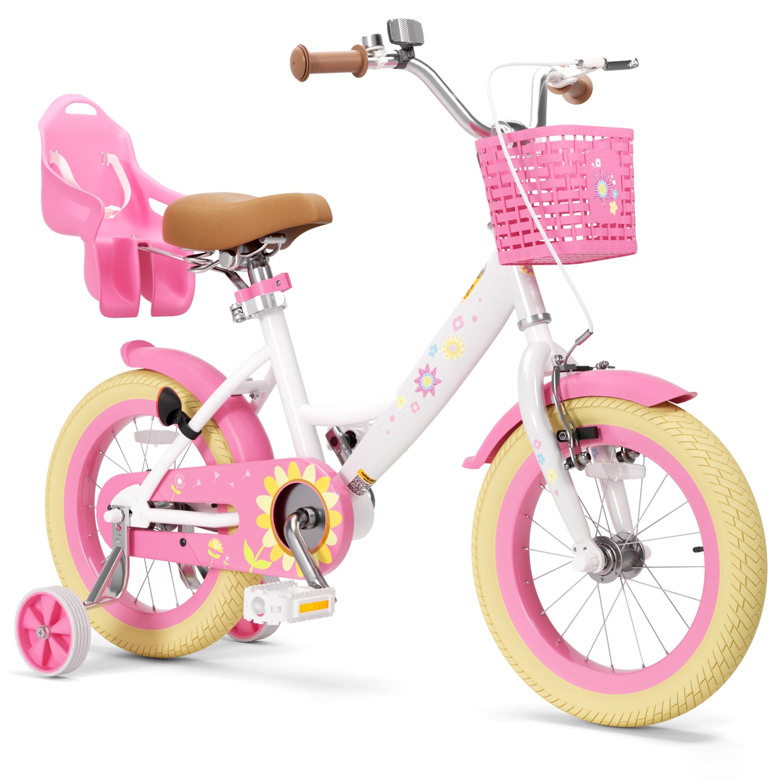 Girls Bike for 2-8 Years Old Kids, 12 14 16 Inch Kids Bike with Training Wheels, Basket and Doll Seat, Children Bicycles with Handbrake & Kickstand, Pink