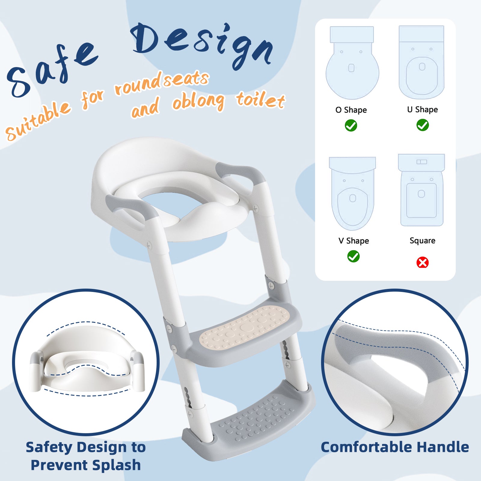 The potty training seat ladder is made of environmental-friendly PP material.It can hold up to 165 lbs(75kg),sturdy enough for your toddlers climb up or down.4 anti-slip strips on the bottom of the seat and the bottom of the footrest to prevent slipping and ensure the safety of the baby.In addition, raised anti-slip points on the pedal surface to ensure safety when kids turn around.