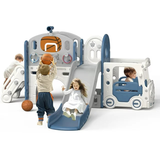 YUFU 10 in 1 Toddler Slide, Kid Slide for Toddlers Age 1+ with Ring Toss, Basketball Hoop and Bus Play House, Indoor Outdoor Slide Toddler Playset Toddler Playground, Blue Gray