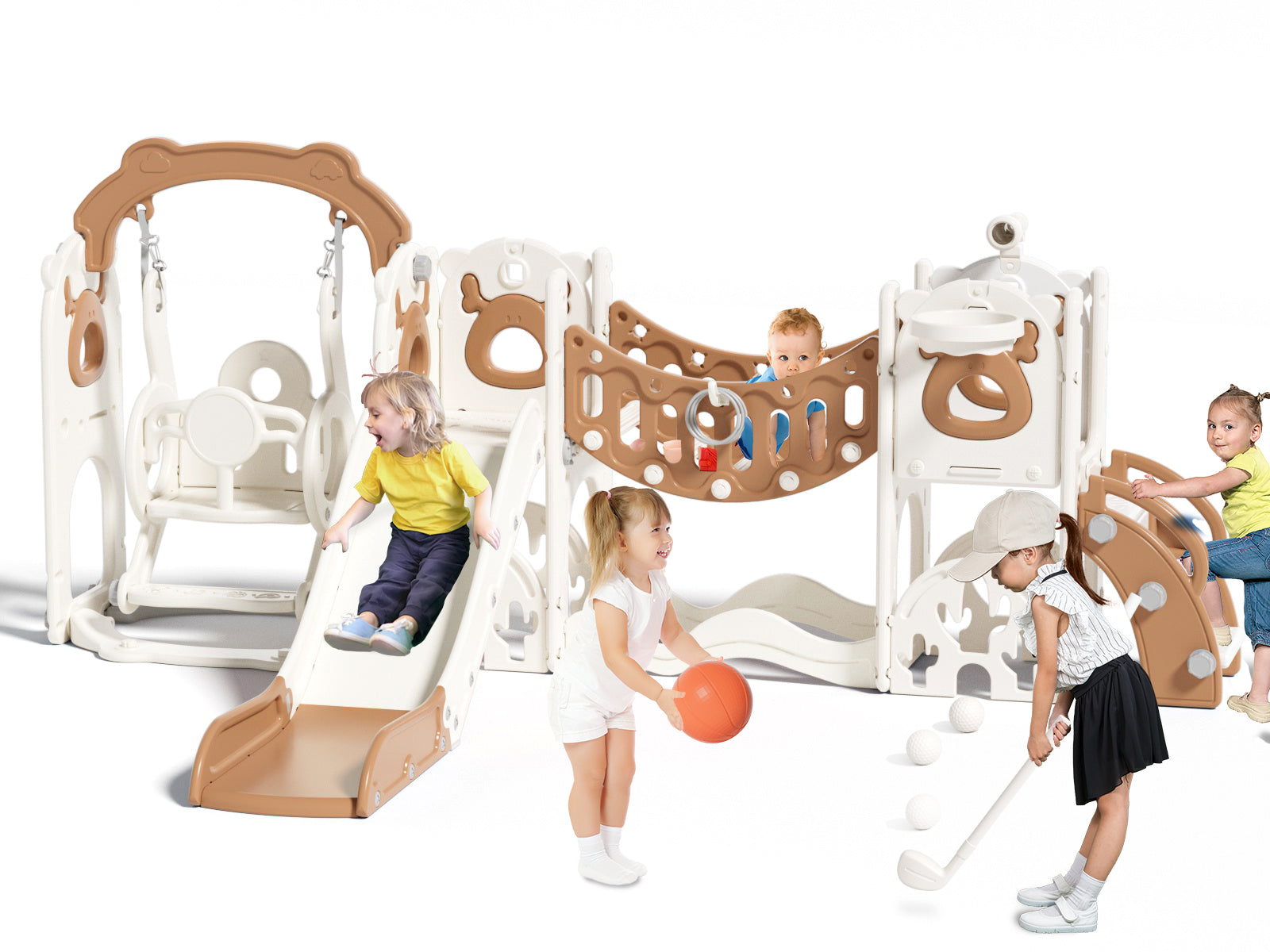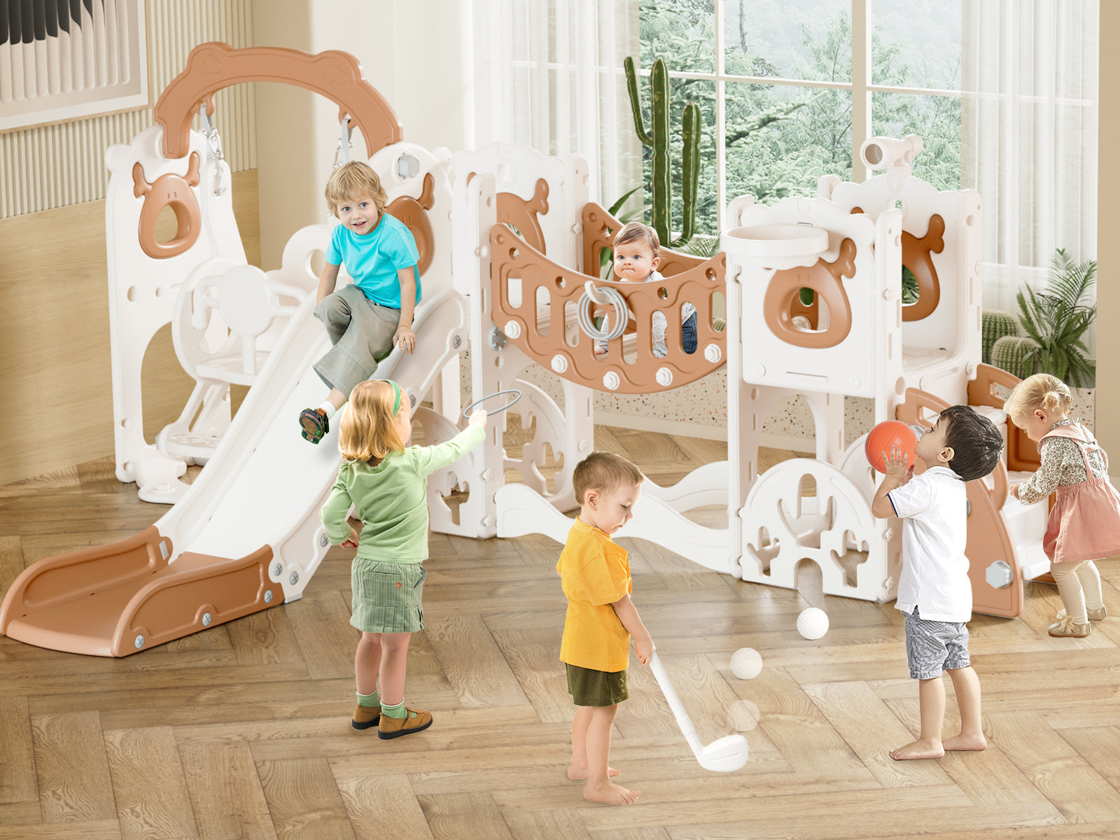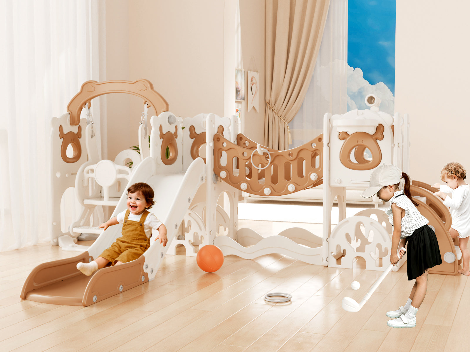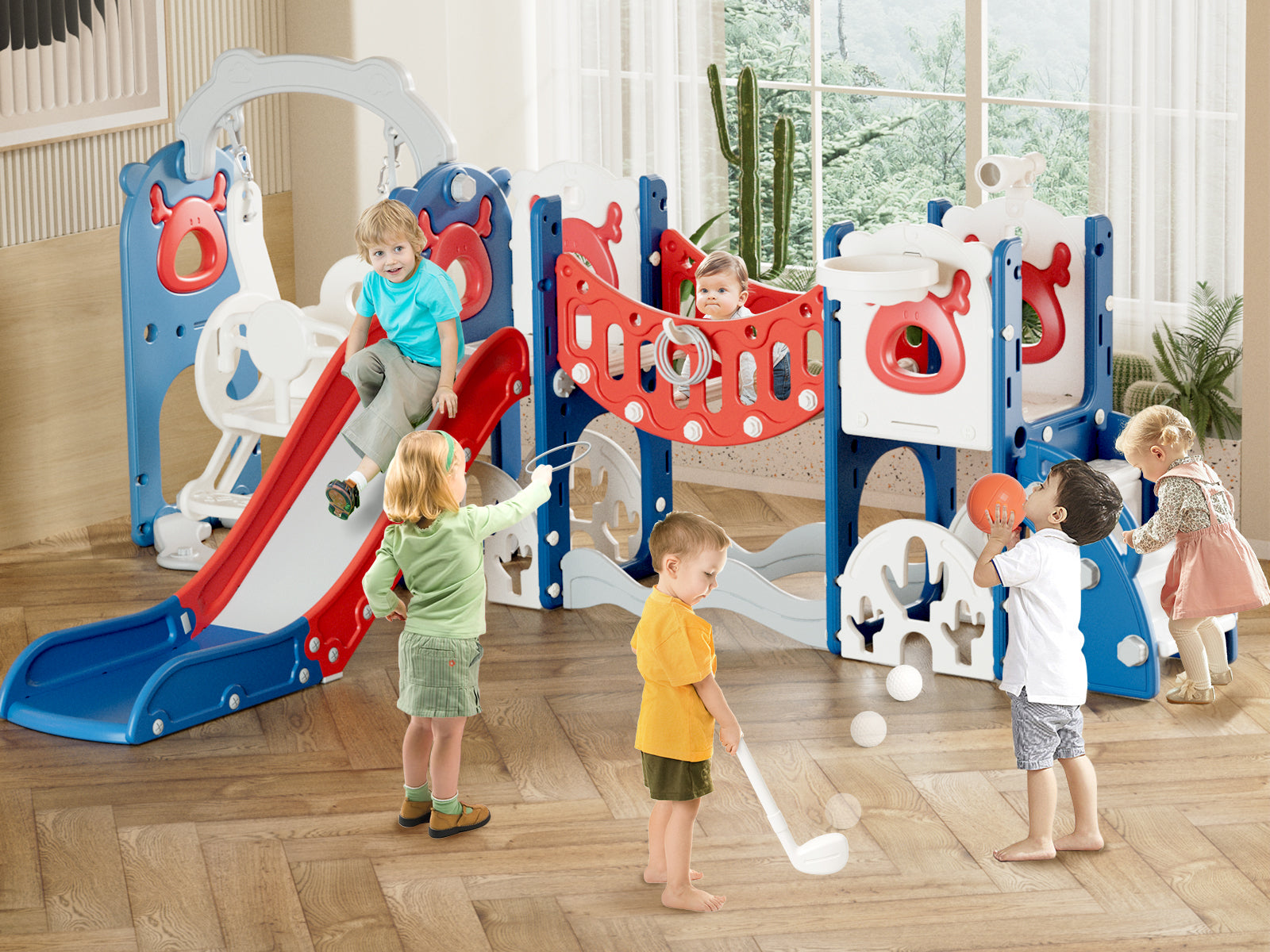 Kids Slide Set with Climber, Toddler Climber Slide Play Set with Basketball Hoop, Tunnel, Bus Playhouse Outdoor Indoor Slide Playset Age 1-6