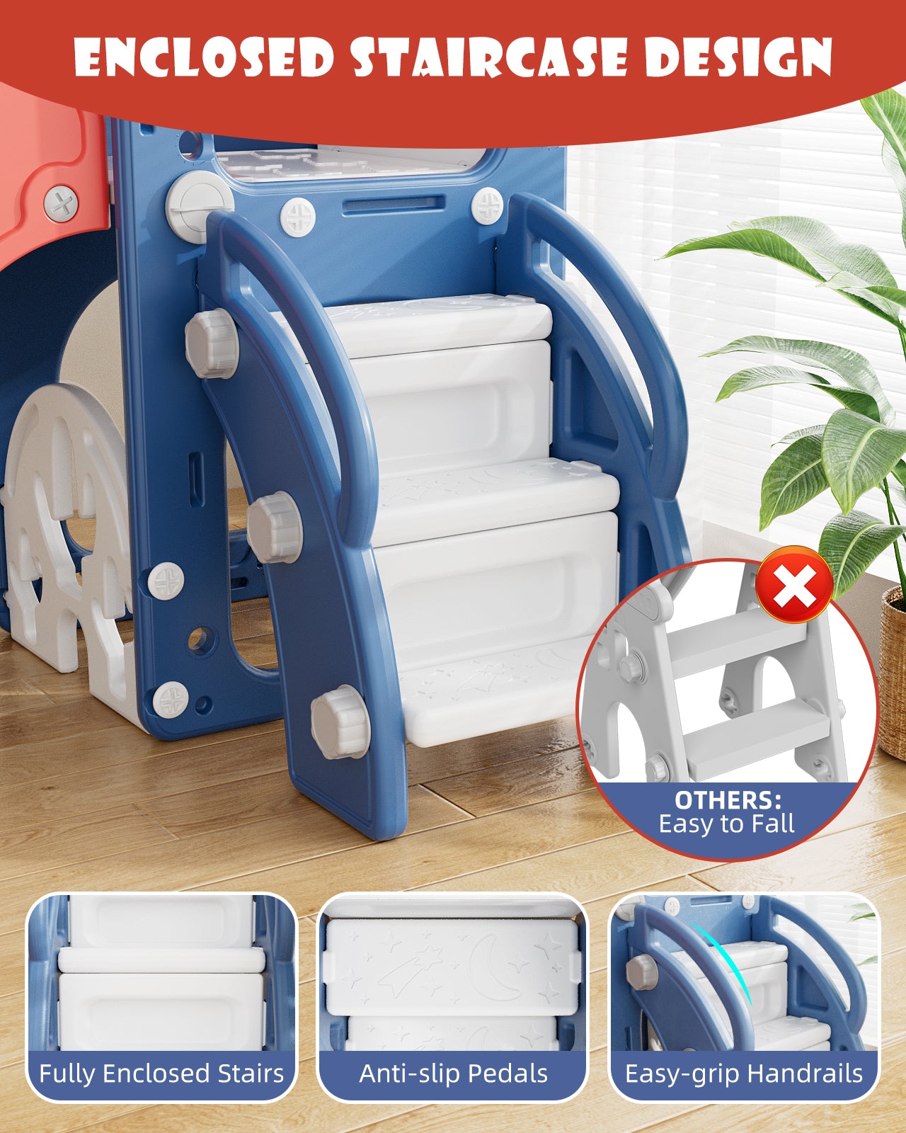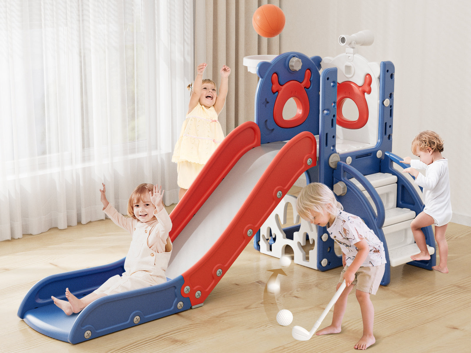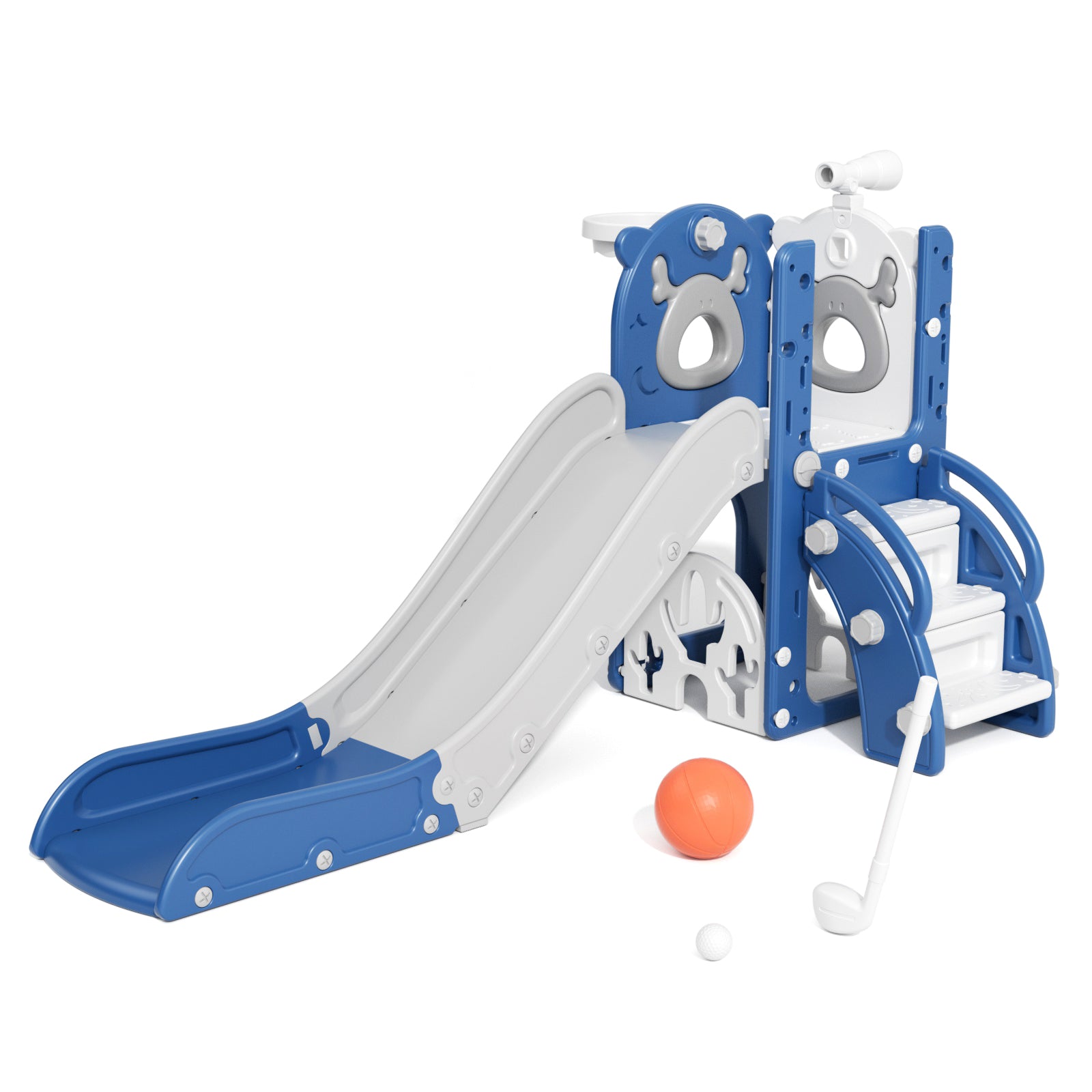 KORIMEFA 7-in-1 Toddler Slide Set, Outdoor Indoor Playset Slide for Kids Age 1-3 with Golf, Basketball Hoop, Backyard Playground Climbing Theme Baby Slide Toy, Blue